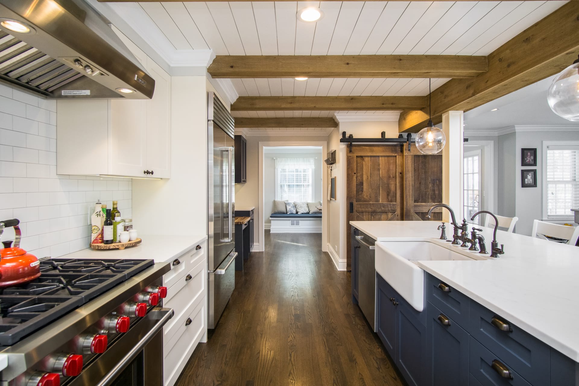 Immediately after establishing the house layout, we got into the details of the kitchen remodeling, which was another priority for our clients. We selected finishes that added character and warmth to the kitchen’s functional layout. Final kitchen design was a blended version that captured the modern rustic feel they were looking for while creating a functional kitchen. Not only the kitchen but also the family room and dining room now feel like one cohesive space they can use as a family.